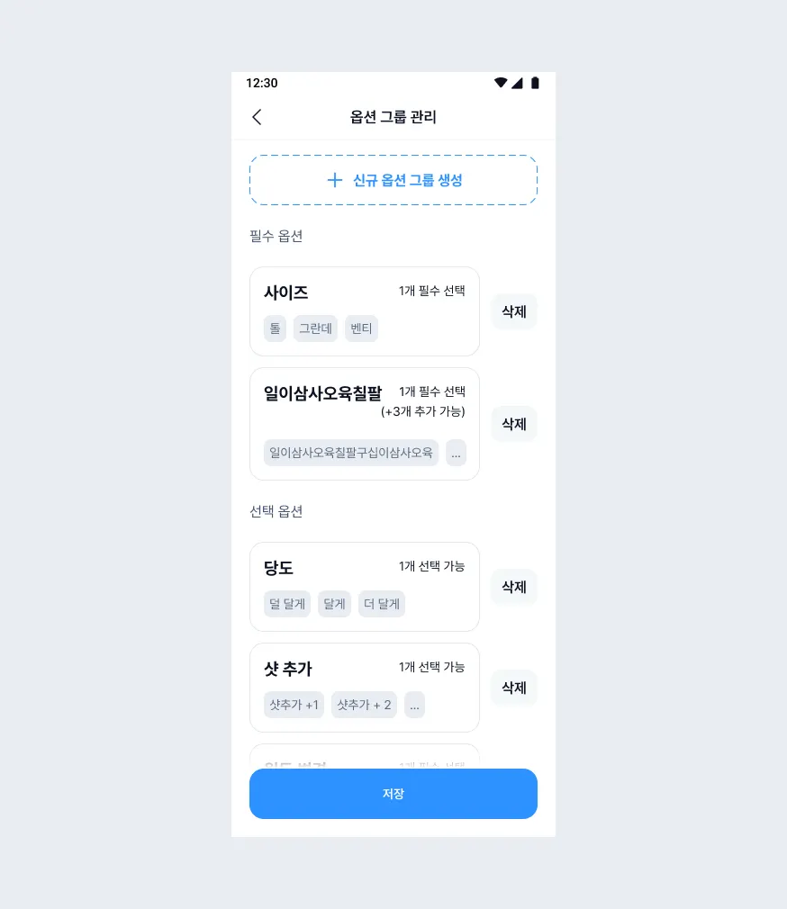 옵션 정보를 입력하고 [저장]을 누르면 옵션 그룹이 등록됩니다.