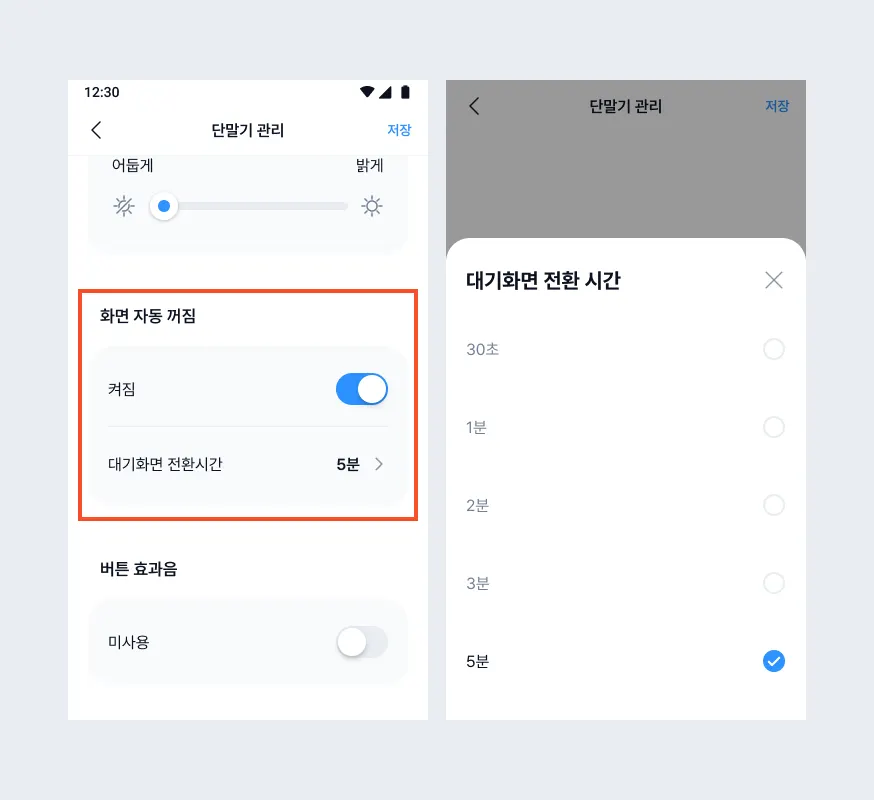 대기화면으로 넘어가는 [화면 전환 시간] 설정 해주세요.